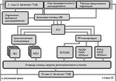 Кэш данных К7 имеет 8 банков и обеспечивает одновременный доступ к двум 64-разрядным величинам при выполнении команд загрузки регистров/записи в память. Другой важной особенностью К7 является наличие в блоке кэша команд специальной кэш-памяти предварительного декодирования, которая используется декодерами команд. Напомним, что в современных высокопроизводительных х86-совместимых процессорах (включая Intel Pentium II/III и AMD K6/K7) произошел отказ от выполнения х86-команд, поскольку они неудобны для достижения максимума производительности. Вместо этого х86-команды декодируются в более простые и эффективные внутренние RISC-подобные команды фиксированной длины, которые собственно и исполняются микропроцессором [1]. В K7 таких декодера три, и они работают параллельно, поэтому кэш предварительного декодирования в существенной степени способствует увеличению пропускной способности.