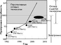 | Рис. 2. Объемы передачи информации в следующем поколении Internet (до 2010 года). Аббревиатура OC (Optical Carrier) означает передачу информации по оптическим каналам с соответствующей цифрам скоростью. Серая область представляет возможности существующей коммерческой технологии и доминирующих систем. Если промышленность будет продолжать полагаться на эту технологию, мы выйдем примерно на верхний предел скоростей передачи в 100 Гигабит в секунду. Для достижения скоростей передачи порядка терабит в секунду мы должны использовать новые технологии, например чисто оптические сети. Cтрелка указывает направление прорыва альтернативных технологий. По мере развития возможностей электроники и начала освноения новых технологий диапазон возможных скоростей передачи информации становится все более неопределенным |
