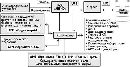 На каждом рабочем месте врача-ангиографиста имеется локальный архив, предназначенный для хранения данных, с которыми работает врач: видеофильмы, кадры, любые другие данные из электронной истории болезни. Видеофильмы из локальных архивов никуда не передаются - они уже хранятся в глобальном архиве. Однако полученные в процессе обработки данные из локальных архивов (обработанные кадры, результаты вычислений и т. п.) поступают в единую базу данных, где и хранятся вместе с другой медицинской информацией.