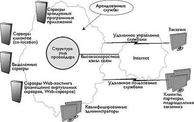 Модель ASP (рис. 1) работает следующим образом. Компания ASP организует у себя узел и концентрирует там ИТ-ресурсы, на основе которых и предлагает услуги. Клиент (арендатор) пользуется предлагаемыми услугами на условиях аренды, выплачивая за их пользование ежемесячную плату. Клиент имеет возможность управлять арендуемыми ресурсами через Internet или частные каналы. За свою арендную плату клиент, при наличии доступа к провайдеру услуг, может получить полностью готовую ИТ-инфраструктуру компании.