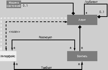 Чтобы определить контекст для стереотипов, которые входят в состав профайла, и показать, как они взаимодействуют друг с другом, использовалась виртуальная, или концептуальная, метамодель. Хотя она не является корректной метамоделью UML, ее, тем не менее, можно использовать для реализации всех практических целей с тем же успехом, как если бы она была таковой. Как показано на рис. 1, эта концептуальная модель использует агента и вентиль в качестве конструкций UML так же, как, к примеру, класс. Более того, каждый стереотип наследует все свойства своего базового элемента модели, в том числе, его атрибуты и связи.
