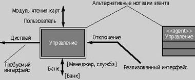 Вентили поддерживают двунаправленные интерфейсы, которые определяют контракты между агентами. Контракты составляют важную часть инфраструктуры моделирования; профайл допускает взаимодействие только между парами реализованных и требуемых интерфейсов. Каждый вентиль может реализовывать несколько интерфейсов, которые должны выполняться агентом, которому принадлежит вентиль. Кроме того, вентиль может требовать, чтобы интерфейсы реализовывали другие агенты. На рис. 2 показан пример нотации для агентов и вентилей. Эта нотация была использована для присваивания альтернативных пиктограмм стереотипам, чтобы выделить их и сделать диаграмму более понятной.