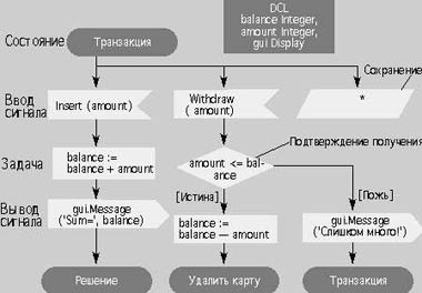 | Рис. 4. Преобразования с действиями Преобразование состоит из операторов, заключенных в своего рода скобки из символов, которые несут в себе информацию о действиях и имеют семантическое значение. Символ ввода указывает сигнал или операцию, которые инициируют преобразование и могут содержать список параметров; символ задачи обычно указывает на присваивание; символ вывода показывает сообщение, которое агент посылает определенному объекту; символ сохранения определяет сигналы, которые необходимо отслеживать; «звездочка» в символе сохранения служит указанием на сигналы и операции, для которых состояние точно не определено, и показывает, что они должны быть обработаны в последующих состояниях. Символ замечания содержит декларации атрибутов (переменных) и ему предшествует ключевое слово DCL, что позволяет отличить замечание от обычных комментариев. |