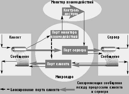 - если монитор взаимодействий запрещает операцию, то микроядро посылает на порт клиента сообщение об отказе в доступе и деблокирует его;