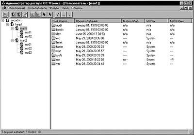«Администратор доступа» реализует просмотр иерархии объектов ОС «Феникс». При этом для каждого пользователя, являющегося подчиненным по отношению к текущему пользователю, может быть открыто отдельное окно, отображающее права этого пользователя на доступ к объектам. Предусмотрена возможность оперативного изменения режима отображения информации в окне управления объектами (скрытие недоступных объектов, сортировка содержимого текущего каталога по именам объектов, дате их создания, убывания/возрастания прав доступа, меток безопасности или категорий).
