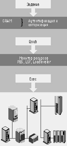 Ограничиваясь только вопросами программного обеспечения ВС, рассмотрим систему Globus, которая даже сейчас является далеко не единственно возможным вариантом. Globus изначально строили снизу вверх, рассматривая в качестве основной цели интероперабельность, т.е. возможность свободного подключения к Сети при условии сохранения управляемой автономии ее участников. Способ достижения этой цели — стандартизация протоколов удаленного доступа к ресурсам, управления ими и их разделения. Любопытно, что другой проект, Legion, первоначально разработанный для Виргинского университета, напротив, начинался со структуры и понятий высокого уровня в духе абстрактных типов данных, но в конце концов пришел почти к тем же самым протоколам, что и Globus.