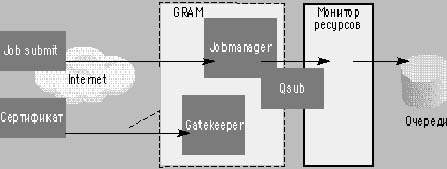 Элементарная ячейка ВС — узел предполагает определенную внутреннюю организацию. Узел образуется из одного или нескольких компьютеров, объединенных закрытой (локальной) сетью, но для вычислительной Сети они выглядят как совокупность ресурсов с одной точкой доступа — через GRAM. Ресурсный пул имеет общее управление — Монитор ресурсов, который, взаимодействуя с ОС составляющих компьютеров, согласованно распределяет их ресурсы, а также контролирует время и объемы использования. В частности, он регулирует процессорную загрузку компьютеров и распределяет между ними задания. Фактически в качестве Мониторов ресурсов применяются системы пакетной обработки заданий [4], причем Globus поддерживает программный интерфейс с несколькими типами таких систем (Condor, PBS, Loadleveler, LSF и т.д.). Интерфейс реализован в компоненте GRAM — Jobmanager, который, отрабатывая запросы, поступающие от пользовательских утилит Globus, вводит задания в кластер (команда Qsub), управляет ими (Qdel, Qalter) и определяет их состояние (Qstat). Рассмотрим, как работает эта архитектура, интерпретируя дистанционный запуск задания — команду job-submit.