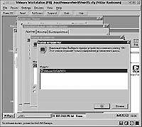 Установка устройства CD-ROM еще проще, чем жесткого диска. Тут надо задать только один параметр — имя устройства. Можно еще определить, подключать ли CD-ROM автоматически при запуске виртуальной машины. Для подключения дисковода гибких дисков надо выбрать тип: устройство или файл и задать или выбрать имя устройства (например, /dev/fd0 or /dev/fd1), определив, будет ли дисковод подключаться автоматически. Необходимо иметь в виду, что физический флоппи-дисковод не может использоваться одновременно операционными системами двух (и более) виртуальных машин или виртуальным и базовым компьютерами. В процессе работы с виртуальной машиной можно в любой момент отключить дисковод, воспользовавшись пунктом «Devices» главного меню. И, наоборот, можно подключить дисковод через тот же пункт меню, освободив его предварительно в других виртуальных машинах и в базовом компьютере. На базовом компьютере для этого надо размонтировать диск (в Linux) или переключиться на какие-то каталоги других дисков во всех запущенных программах (если на базовом компьютере запущена Windows).