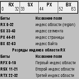 ASCE могут задавать либо одну область емкостью 2 Гбайт (если поле RX нулевое), либо до 233 областей с суммарной емкостью адресного пространства 264 байт. Если RX равно нулю, для преобразования виртуальных адресов в реальные используют всего две таблицы — таблицу сегментов и таблицу страниц. Если же значение RX отлично от нуля, требуется от одной до трех дополнительных таблиц, называемых в соответствии с полями RX — RFT, RST, RTT. В последнем случае преобразование адресов сильно усложнено; поэтому для его ускорения применяются буферы быстрой переадресации TLB.