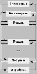 Ясно, что в этом стиле вполне можно описать почти любое взаимодействие. В зависимости от «низкоуровневости» приложения или «мощности» устройства какое-то количество уровней может отсутствовать; можно добавить или убрать какие-то специфические модули в любую позицию между уже существующими модулями, головой очереди и драйвером устройства. Это позволит добавить шифрование и другие функции — все, что угодно.