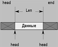 Другое решение предполагает возможность заранее зарезервировать необходимое место для всех требуемых префиксов и постфиксов. Естественно, это возможно только в том случае, когда верхний уровень драйвера знает достаточно о потребностях нижних уровней (рис. 2б). Это жесткое, но не фатальное условие: просто нижние уровни должны сообщить верхним о том, как много данных (максимум) им может потребоваться добавить в начало и конец пакета. Для того чтобы работать с такими объектами, нужно знать начало выделенной области, общий размер и два указателя на текущую использованную область. Особенно полезна такая структура на этапе приема пакета. Если уж пакет получен в виде непрерывного участка памяти, то отбрасывание соответствующих элементов выразится просто в изменении двух указателей.