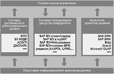 - На уровне линейного предприятия используются программные системы типа Navision, Axapta и т.д., которые позволяют вместо сложного клиента R/3 на конкретном складе поддерживать более простое и дешевое решение.