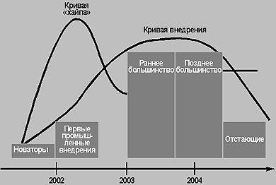 | Рис. 1. Giga Group: кривые «хайпа» и внедрения пересекутся в 2002 году |