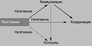 Расстояние усугубляет возникающие при координации и контроле проблемы напрямую или косвенно, за счет ограничений, которые оно накладывает на коммуникации. Жирными стрелками на рис. 2 показаны основные трудности глобальной разработки.