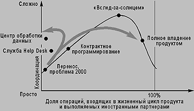 Стремясь снизить сложность координации, многие организации движутся в одном из двух направлений (на рис. 4 они показаны стрелками) — вдоль графика либо налево, либо направо. В обоих случаях сложность координации остается относительно низкой. Ключевое различие связано с тем, какой объем задач в течение жизненного цикла продуктов выполняет Иностранный партнер. Следование левой стрелке (такая тактика характерна для крупной корпорации) часто выражается в передаче партнерам работ по сопровождению, службы Help Desk и центров обработки данных.