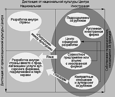 На рис. 5 общая структура организации и глобальной разработки представлена на графике параллельно со спектром культурных различий. Две оси указывают диапазон различий в национальной культуре и культуре компании. На левой границе диапазона (наименее проблематичный случай) — создание команд по исследованиям и разработке внутри страны и внутри компании. На правой границе (различия максимальны) — аутсорсинг выполняется в другой стране или компанией, работающей по контракту.