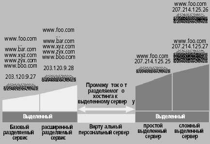 | Рис. 2. Виртуальные среды (или виртуальные приватные серверы) заполняют промежуток между разделяемым хостингом и использованием выделенных серверов, но, тем не менее, решение HSPcomplete позволяет обеспечить на одной платформе все виды хостинга, включая разделяемый и аренду выделенных серверов |