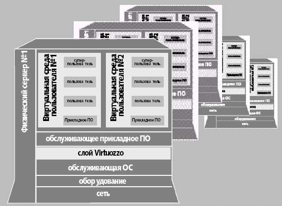 | Рис. 3. Кластер из набора физических серверов, работающих на базе технологии Virtuozzo |