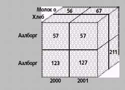 В общем случае куб позволяет представить только два или три измерения одновременно, но можно показывать и больше за счет вложения одного измерения в другое. Таким образом, путем проецирования куба на двух- или трехмерное пространство можно уменьшить размерность куба, агрегировав некоторые размерности, что ведет к работе с более комплексными значениями параметров. К примеру, рассматривая продажи по городам и времени, мы агрегируем информацию для каждого сочетания город и время. Так, на рис. 1, сложив поля 127 и 211, получаем общий объем продаж для Копенгагена в 2001 году.