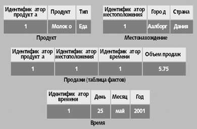 Схемы «звезда» и «снежинка» отличаются в том, как они поддерживают измерения, и выбор между ними, в основном, зависит от того, какими свойствами должна обладать разрабатываемая система. Как показано на рис. 3, в схеме «звезда» на каждое измерение отводится одна таблица. Таблица измерений содержит ключевой столбец, по одному столбцу для каждого уровня измерений с текстовыми описаниями значений этого уровня, и по одному столбцу для каждого свойства уровня в измерении.
