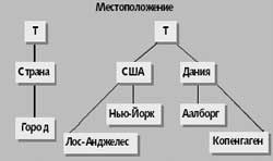 На рис. 2 показана схема «Местоположение» для данных продаж из таблицы 1. Из трех уровней измерений местоположения самый низкий — «Город». Значения уровня «Город» группируются в значения на уровне «Страна», к примеру, Аалборг и Копенгаген находятся в Дании. Уровень T представляет все измерения.