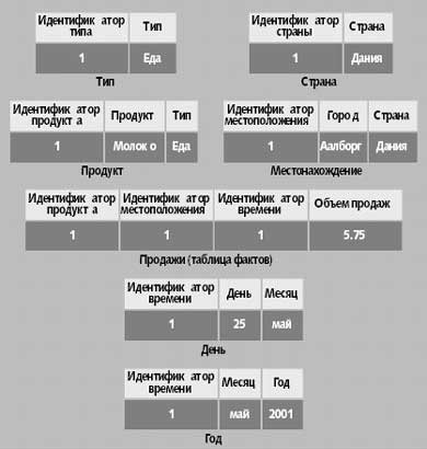 На рис. 1 показан куб, содержащий данные по продажам в двух датских городах, указанных в таблице 1 с дополнительным измерением — «Время». В соответствующих ячейках хранятся данные об объеме продаж. В примере можно обнаружить «факт» — непустую ячейку, содержащую соответствующие числовые параметры — для каждой комбинации время, продукт и город, где была совершена, по крайней мере, одна продажа. В ячейке размещаются числовые значения, связанные с фактом — в данном случае, это объем продаж — единственный параметр.