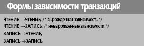 Оказалось, что изолированность транзакций нарушена: параллельное выполнение дало результат, отличный от последовательного выполнения. В данном случае имела место зависимость рассматриваемых транзакций друг от друга. Обсудим этот вопрос подробнее.