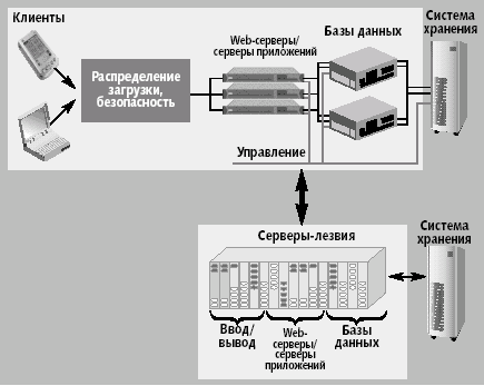 Сравнение конструкции центра обработки данных на основе встраиваемых серверов и серверов-лезвий. Со временем и внешняя память может быть упакована в формат лезвия