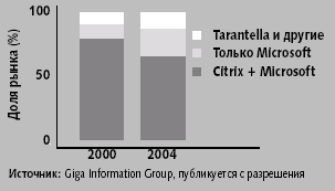 Согласно прогнозам, к 2005 году оборот этого рынка может достичь 3 млрд. долл. Доминируют на нем три компании: Citrix, Microsoft и Tarantella (ранее компания Santa Cruz Operation). Среди других, более мелких игроков можно назвать GraphOn, NCD, AppStream и NeTraverse (см. рис. 3).