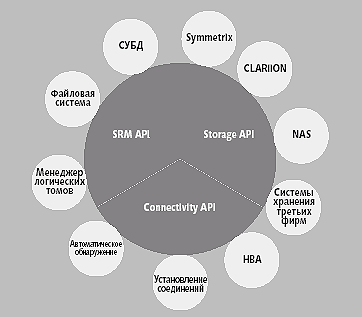 - Storage Resource Management (SRM) API - средства интеграции прикладных модулей управления ресурсами хранения, которые обеспечивают информацию о среде хранения в целом, включая логическое размещение баз данных и файловых систем, физическое представление систем хранения на уровне блоков и информацию о хостах.