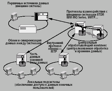 В прикладной системе можно выделить три основных узла: первичные системы (источники данных от систем других разработчиков), центральный обрабатывающий комплекс и локальные системы, обслуживающие пользователей (рис. 4). Центральный обрабатывающий комплекс по определению не работал с пользователями. Его главной задачей была обработка данных и поддержка основной базы данных, соответственно, он в основном состоял из модулей обработки сообщений. Локальные системы состояли преимущественно из модулей, обеспечивающих доступ к данным конечных пользователей. Модуль обработки сообщений в локальных системах обеспечивал обмен по протоколу MTP и синхронизацию данных между основной и локальной базой данных.