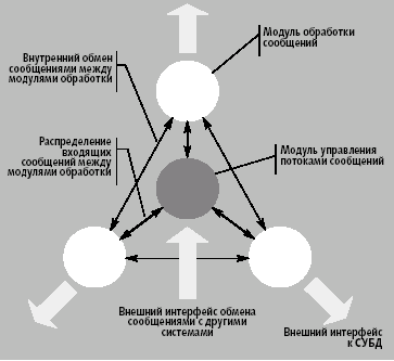 Все поступающие сообщения возникали в результате некоего события в реальном времени (изменение состояния устройств, заполнение формы, таймер и т.д.), а после полного цикла обработки система переходила в состояние ожидания следующего сообщения. Каждый цикл обработки разбивался на отдельные этапы, по завершению которых нужно было что-либо записать в базу данных и передать сообщение на следующий этап, исключая сообщения, которые могли быть обработаны за один шаг. А поскольку данные от разных систем поступали асинхронно, легко было организовать независимую обработку различных групп сообщений. Разбивка обработки каждого сообщения на этапы дала возможность выполнять эти этапы независимо. Система, реализующая такой механизм обработки, могла бы состоять из набора модулей, параллельно выполняющих обработку сообщений на каждом отдельном этапе и обменивающихся сообщениями между собой.