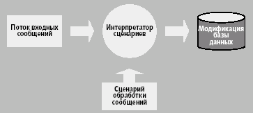 В качестве обработчика события было решено использовать отдельный, независимый модуль, на вход которому передавалось пришедшее сообщение, а тот в свою очередь выполнял его обработку, опираясь на сценарии, созданные специально для каждого этапа обработки. Для сохранения результатов модуль имел необходимый набор функций работы с СУБД (рис. 1).