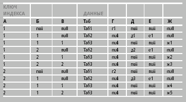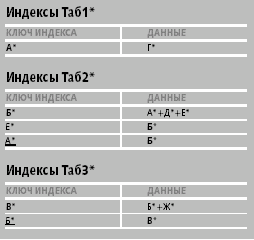 Чуть более усложненный вариант примера 1 показан на рис. 2. Поскольку первичные ключи — составные, то в ключе индекса записываются не атомарные значения составляющих его атрибутов, а их «кластер». Если бы, например, значения относились к строковому типу данных, то таким кластером будет строка, полученная путем присоединения строки второго значения к строке первого. Первый пример отличается от второго также тем, что в нем нет необходимости индексации ссылочных ключей, так как они входят в состав «головы» индекса первичных ключей. Напротив, дополнительно проиндексирован атрибут В, поскольку индексация А+Б+В нам ничего не дает для поиска по значениям В: они находятся не в «голове» ключа индекса, а в его «хвосте».