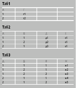 | Пример 1. Атрибуты ссылочных ключей с именами А в Таб2 и А+Б в Таб3 входят в состав составных первичных ключей А+Б и А+Б+В этих же таблиц |