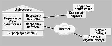 | Рис. 4. Портлеты работают на локальном сервере порталов. В этом случае кадровый портал предоставляет пользователям доступ к Internet-службе погоды и кадровым приложениям из внутренней ERP-системы |