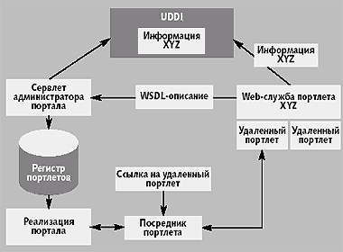 Web-службы для удаленных порталов (Web services for remote portals, WSRP) представляют собой визуальные, настроенные на пользователя компоненты Web-служб, которые подключаются визуально, методом буксировки к порталам или другим промежуточным Web-приложениям, объединяющим информационное наполнение из различных источников. Поставщики информационного наполнения и приложений реализуют свою службу как Web-службу удаленного портала и публикуют ее в общедоступном каталоге (например, в реестре Universal Description, Discovery, and Integration). Этот каталог позволяет владельцам порталов легко находить необходимые службы. Элементы каталога, опубликованные в формате Web Services Description Languag, кратно описывают компонент WSRP и предоставляют детальную информацию о службах. Посредник портлета связывается с компонентом WSRP через SOAP, а протокол удаленного вызова портлета (remote portlet invocation, RPI) гарантирует корректное взаимодействие между обеими сторонами. На рис. 5 показан пример того, как портал находит и интегрирует удаленный портлет.