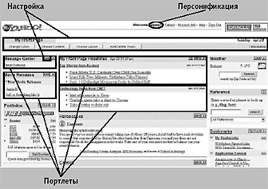 Большинство современных серверов порталов базируются на Java. Компании Epicentric и Plumtree, пожалуй, первыми предложили серверы порталов как отдельные продукты. С приобретением компании TopTier корпорация SAP смогла присоединиться к ним имеющемуся в ее системе уровню интеграции приложений iViews. Корпорация IBM предлагает WebSphere Portal Server, который базируется на технологиях свободно распространяемой портальной платформы Jetspeed, реализованной в рамках проекта Apache. Со своей стороны, Apache принимает участие в разработке спецификаций для API портлетов в стандарте J2EE, благодаря чему Jetspeed стал серьезным кандидатом на роль эталонной реализации нового стандарта. Еще одна свободно распространяемая портальная платформа Zope реализована компанией Python. Помимо функций портала Zope предлагает некоторые возможности управления информационным наполнением и общие службы Web-приложений. (Этот список, конечно, не полон.)