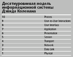 | Для иллюстрации роли и места средств управления проектами Колеман предложил расширенную десятиуровневую модель, построенную на основе популярной семиуровневой модели ISO/OSI. К известным семи уровням он добавил еще три. |
