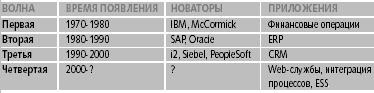 В таблице предложена достаточно грубая классификация корпоративных систем по историческим волнам — в той последовательности, как появлялись те или иные новации. Это вовсе не смена поколений (и первая, и вторая волны живут и развиваются), а скорее отражение некоторой динамики. Несложно заметить, как с каждой новой волной возрастает значимость информационной системы как консолидирующего инструмента, как она прорастает в тело производственного процесса. Переход на самообслуживание и самоуправление — вполне закономерный результат.