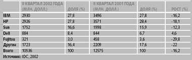В США объем поставок за тот же период вырос по сравнению с прошлым годом на 9,9%, а во всем мире было продано 1,08 млн. систем. Ухудшение ситуации связано главным образом с отсутствием инвестиций в новые проекты. Наибольшим спросом пользовались системы стоимостью до 5 тыс. долл. и серверы, монтируемые в стойку. Первое и второе место по величине доли рынка поделили IBM и Hewlett-Packard, однако IBM демонстрирует значительный рост бизнеса, связанного с ОС Linux — 36%. Третье место у Sun Microsystems. Почти все лидеры продали меньше серверов, чем в прошлом году. Прибавить удалось только компании Dell, занявшей четвертое место.