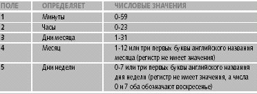 Каждая строка crontab-файла (кроме строк комментариев со знаком # в первой позиции) либо устанавливает значение некоторой переменной, либо представляет отдельное задание. Строка задания состоит из шести полей, разделенных пробелами. Первые пять полей отведены для указания времени выполнения задания. В таблице 1 представлены значения, которые можно придавать этим полям.