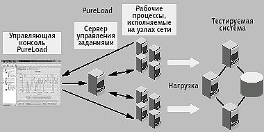 Для создания нагрузки PureLoad может использовать распределенные вычисления. Каждый из узлов вычислительной системы, осуществляющей тестирование сервера, исполняет «рабочий процесс» (worker process), которому соответствует копия виртуальной машины Java. Каждый рабочий процесс порождает определенное число рабочих нитей. Управление рабочими процессами осуществляется посредством «менеджеров» (manager process) — серверных процессов, запускаемых по одному на каждый узел. Выделяется также узел Task Space Server, осуществляющий параметризацию сценариев, подготовленных с помощью консоли администрирования, и распределение их между рабочими процессами (рис. 1).