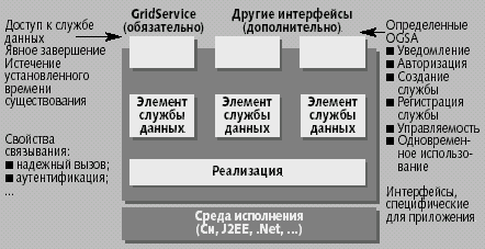 Grid-служба OGSA. Служба состоит из элементов данных и различных обязательных и дополнительных интерфейсов, с потенциальным воплощением через различные реализации, возможно, в разных средах
