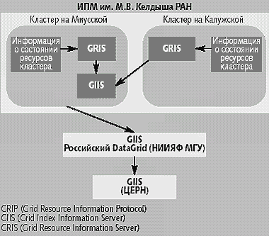 Служба каталогов. Поскольку GIIS содержит информацию о всех ресурсах Grid, для поиска ресурсов с нужными свойствами достаточно направить запрос в одну точку, а не опрашивать каждый ресурс по отдельности. Способ наполнения сервера GIIS состоит в периодическом обновлении информации путем опроса зарегистрированных по протоколу GRIP служб ресурсов.