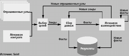 Saint — сканер, которые проверяет системы на наличие уязвимых мест. С учетом конкретной конфигурации механизм контроля определяет, может ли Saint (и до какой степени) сканировать набор сетевых узлов. Подсистема выбора целей создает список атак для тестов, запускаемых на сканируемых узлах. Подсистема сбора данных собирает факты о результатах работы зондов. С помощью базы правил механизм взаимодействий обрабатывает факты, при этом собирая данные и определяя новые адресуемые хосты, зонды и факты. Подсистема результатов отображает собранные данные как гиперпространство, с которым пользователи могут работать с помощью браузера
