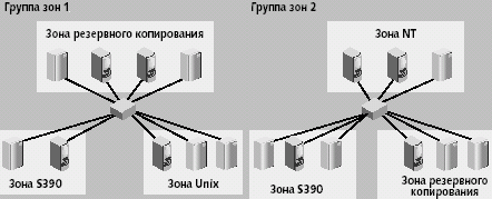 | Группы зон — это совокупности зон, ограничивающие поток трафика между различными устройствами. Группа зон 1 используется при резервном копировании NT-серверов и включает в себя накопитель на магнитной ленте. Группа зон 2 используется при резервном копировании Unix-серверов и включает в себя тот же накопитель на магнитной ленте |