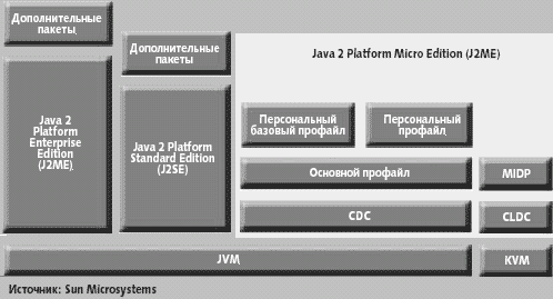 Каждая из трех основных Java-платформ корпорации Sun Microsystems рассчитана на работу на определенном типе машин. Java 2 Platform Enterprise Edition ориентирована на серверы, Java 2 Platform Standard Edition — на рабочие станции, ПК и мобильные компьютеры, а Java 2 Platform Micro Edition — на PDA, сотовые телефоны и другие портативные системы. J2EE и J2SE используют полнофункциональную виртуальную машину Java. Платформа J2ME также работает с упрощенными виртуальной машиной K (K Virtual Machine, KVM), подсоединенной ограниченной конфигурацией устройств (Сonnected Limited Device Configuration, CLDC) и профайлом мобильных информационных устройств (Mobile Information Device Profile, MIDP)