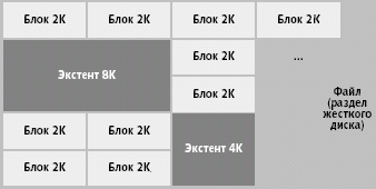 Пространством внешней памяти, отведенным ему администратором, сервер управляет с помощью экстентов (extent), т.е. непрерывных последовательностей блоков. Информация о наличии экстентов для объекта схемы данных находится в специальных управляющих структурах, реализация которых зависит от СУБД. На управление экстентами (выделение пространства, освобождение, слияние) тратятся определенные ресурсы, поэтому для достижения эффективности нужно правильно определять их параметры. СУБД от Oracle, IBM, Informix позволяют определять параметры этих структур, а в Sybase экстенты имеет постоянный размер, равный 8 страницам. Уменьшение размера экстента будет способствовать более эффективному использованию памяти, однако при этом возрастают накладные расходы на управление большим количеством экстентов, что может замедлить операции вставки большого количества строк в таблицу. Кроме того, сервер может иметь ограничение на максимальное количество экстентов для таблицы. При слишком большом размере экстентов могут возникнуть проблемы с выделением для них необходимого количества памяти. Обычно определяется размер начального экстента, размер второго и правило определения размеров следующих экстентов. На рис. 2 иллюстрируется взаимосвязь блоков, экстентов и файлов баз данных.