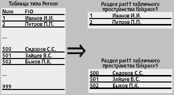 Здесь создаются два раздела part1 и part2, каждый из которых размещен в своем табличном пространстве (tblspace1 и tblspace2). Записи со значением поля num от 1 до 499 будут располагаться в первом разделе, а записи с номерами от 500 до 1000 — во втором (рис. 4).